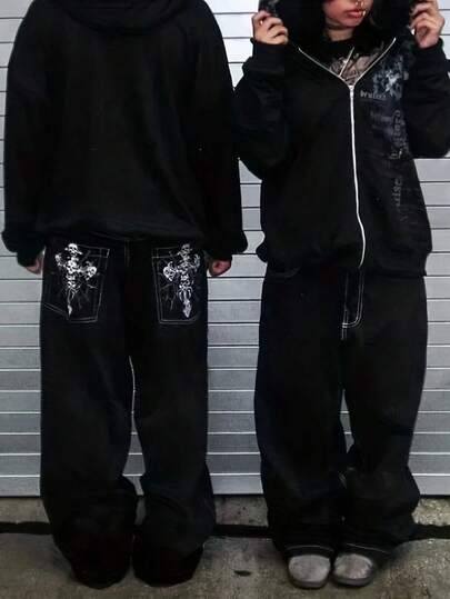 Straight Leg Wide Leg Washed Loose Casual Embroidery Jeans - Black - View 1