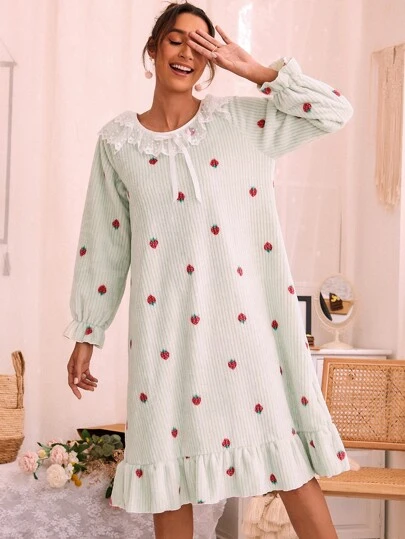 Strawberry Print Contrast Lace Flannel Night Dress - Mint Green - View 1