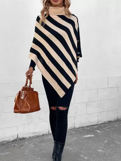 SHEIN LUNE Striped Pattern Turtleneck Batwing Sleeve Knit Poncho - Multicolor - View 1