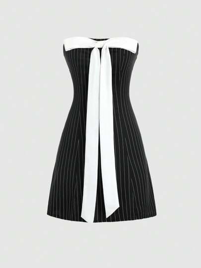 Sweetra Striped Strapless Dress With Bow Decoration - Black and White - View 1