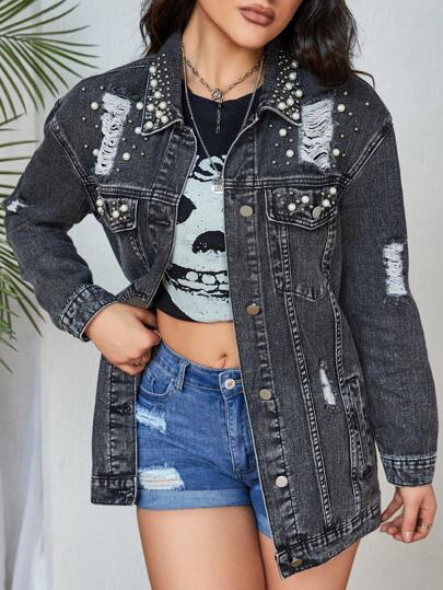 Women's Spring Denim Jacket With Rivet Decor, Distressed, Flap Pockets, Drop Shoulder - Dark Grey - View 1