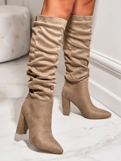 Suedette Point Toe Chunky Heeled Slouchy Boots - Khaki - View 1