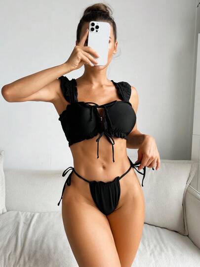 SHEIN Swim Summer Women's Ruffle Trim Padded Knot Side Bikini Set - Black - View 1