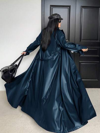 Sunspun Plus Size Lapel Belt A-Line Pocket Long Sleeve PU Windbreaker - Navy Blue - View 1