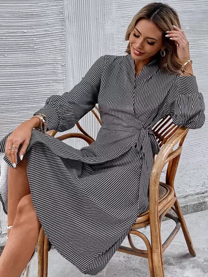 Surplice Front Knot Waist Plaid Dress - Black and White - View 7