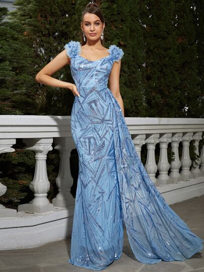 Missord Sweetheart Neck Contrast Mesh Draped Detail Sequin Formal Dress - Blue - View 1