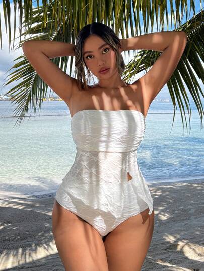 Swim Mod Summer Beach Women's Bandeau Bikini Set With Split Skirted Bottom - White - View 1