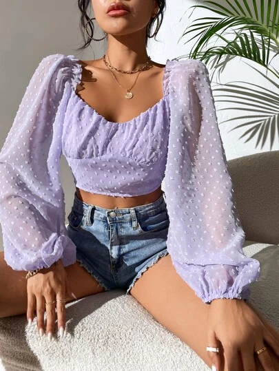 Swiss Dot Ruched Bust Frilled Lantern Sleeve Crop Chiffon Blouse - Lilac Purple - View 1