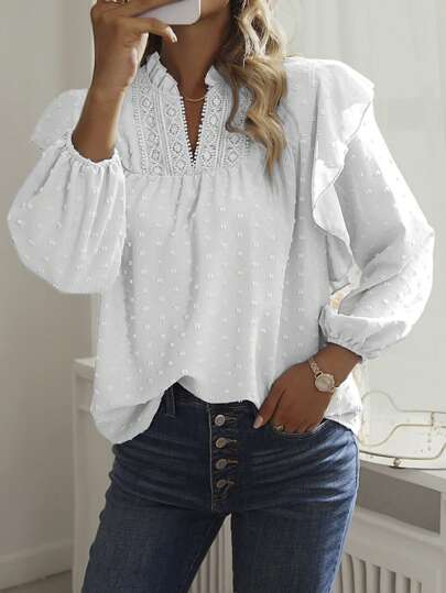 SHEIN Holidaya Swiss Dot Ruffle Trim Lantern Sleeve Blouse,Long Sleeve Tops Fall Cloth For Women - White - View 1