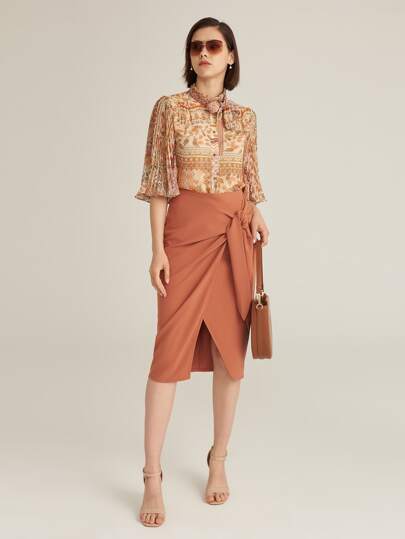 SHEIN TIE FRONT SARONG WRAP SKIRT - Brown - View 1