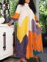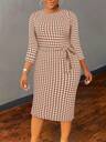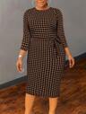 Plus Size Women's Houndstooth Print Crew Neck Long Sleeve Midi Dress