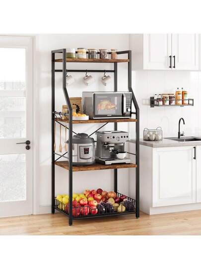 Techigher Kitchen Bakers Rack,Microwave Oven Stand,4-Tier Kitchen Storage Shelf Rack,Industrial Coffee Bar Station With Large Wire Basket,8 Hooks For Spice Pots Organizer - Brown - View 1