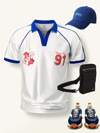 SHEIN Teen Boys Casual Short Sleeve Polo T-Shirt, Color Block Black & White, Racing Car English Print, Sports & Street Fashion, Punk Rock, School Uniform, Suitable For Spring & Summer Occasions, Parties, Festivals