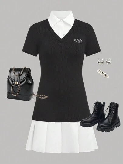 SHEIN Teen Girl Back To School Metal Decor Lapel Short Sleeve Pleated Patchwork Fitted Dress - Black and White - View 1