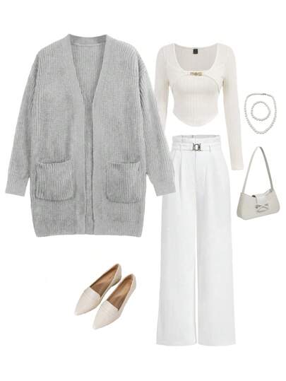 Teen Girl Casual Everyday Solid Color Loose Fit Ribbed Knit Front Open Cardigan, Autumn/Winter - Grey - View 1