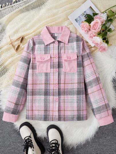 Teen Girl Pink Plaid Patchwork Pocket Casual Jacket, Spring Autumn Winter - Multicolor - View 1