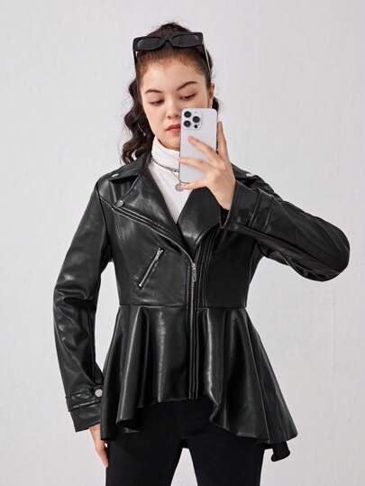 Teen Girl Zip Up Ruffle Hem PU Leather Coat - Black - View 1