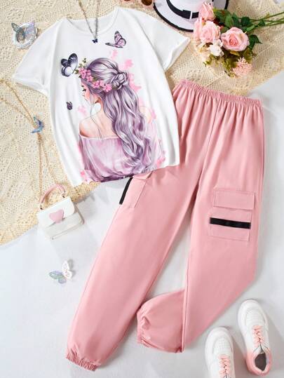 Teen Girls' Cartoon Character Butterfly Printed T-Shirt And Cargo Pants Set - Multicolor - View 1