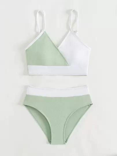 Teen Girls Color Block Ribbed Knit Bikini Set Summer Beach - Mint Green - View 1