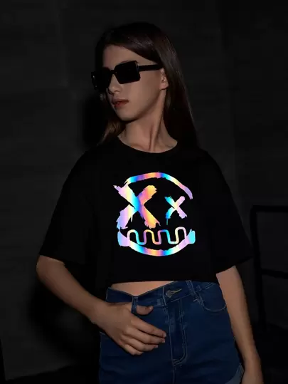 SHEIN Teen Girls Reflective Cartoon Print Crop Tee - Black - View 1