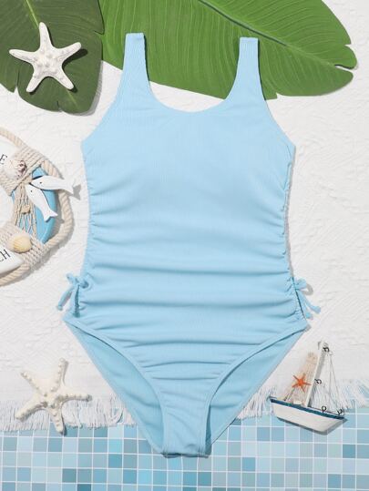 Teen Girls Rib Drawstring One Piece Swimsuit - Baby Blue - View 1