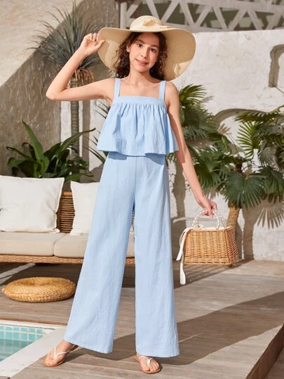 SHEIN Teen Girls Ruffle Trim Wide Leg Cami Jumpsuit - Baby Blue - View 1