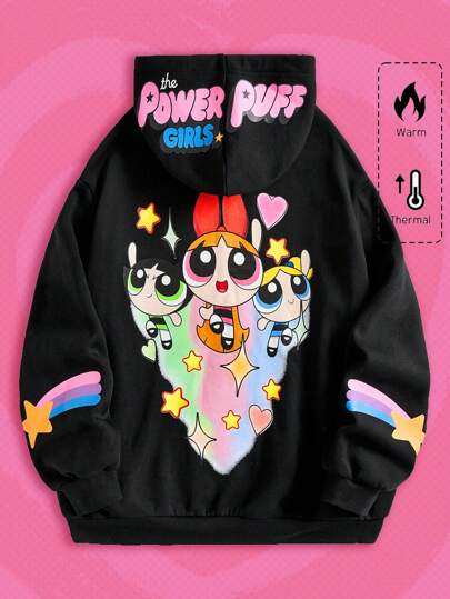 The Powerpuff Girls | ROMWE Cartoon Print Hooded Sweatshirt, School - Black - View 3