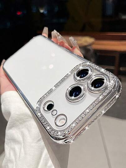 This High-End Rhinestone Plated Transparent Phone Case Is Crafted With A Luxurious Plating Process, Showcasing An Exquisite And Glamorous Design. The Shimmering Design Not Only Looks Stunning, But Also Effectively Protects The Phone Camera Lens. It Is Designed To Fit A Variety Of Models, Including The Latest 17 Pro Max And Other Popular Versions, Ensuring A Perfect Fit And Reliable Protection For Your Beloved Device. - Silver - View 1