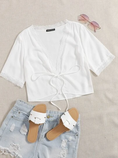 Tie Front Lace Trim Top - White - View 1
