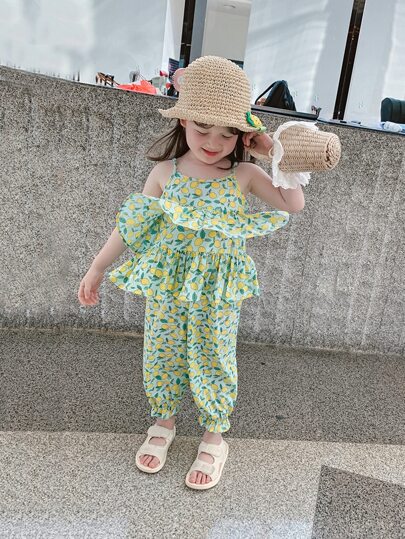 Toddler Girls Allover Print Ruffle Trim Cami Top & Trousers - Green - View 1