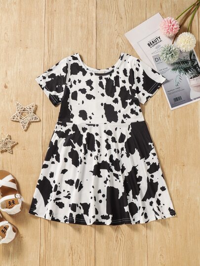 Toddler Girls Cow Print Dress - Black and White - View 1