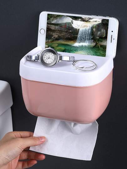 1pc Waterproof Toilet Paper Holder Box, Bathroom Tissue Dispenser, No Need To Drill, Wall Mounted - Pink - View 1