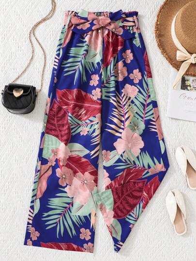 SHEIN Tropical Leaf Print Wide Leg Pants With Belt - Blue - View 6