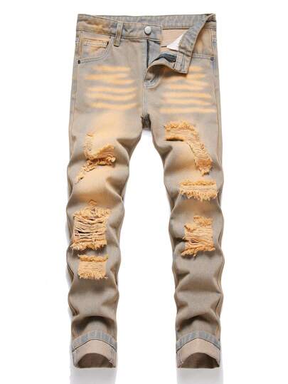 Tween Boy Ripped Frayed Bleach Wash Jeans - Camel - View 1