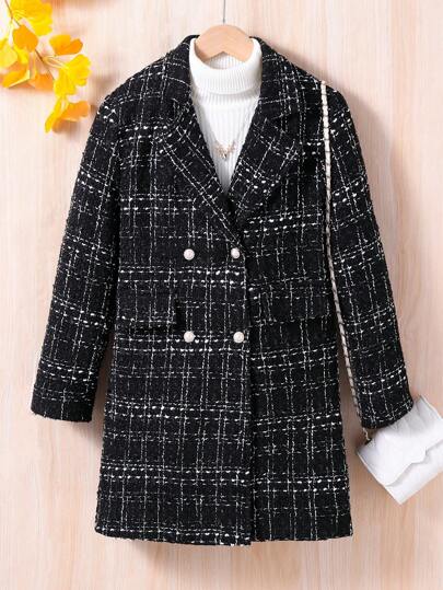 SHEIN Tween Girl 1pc Plaid Double Breasted Overcoat - Black - View 1