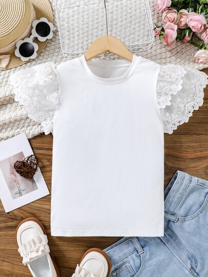 Tween Girl Contrast Lace Butterfly Sleeve Tee,Holiday,Summer,Travel - White - View 1