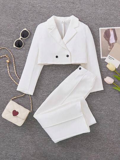 Tween Girl Double Button Crop Blazer & Pants - White - View 1