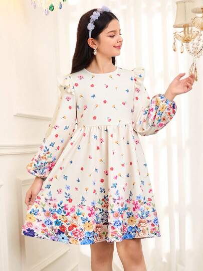 SHEIN Tween Girl Floral Print Knit Round Neck Loose Elegant Dress - White - View 1