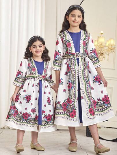 SHEIN Leap Crew Tween Girl Printed Coat And Belt Decor Round Neck Dress 2Pcs Set - Dark Green - View 1