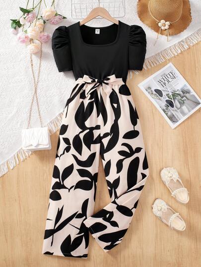 SHEIN Tween Girls''Holiday Fashionable Casual Style Knit Ditsy Floral Patchwork Square Neck Short Sleeve Jumpsuit - Black - View 1