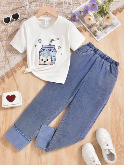 SHEIN Tween Girls' Cartoon Milk Printed Round Neck Short Sleeve T-Shirt + Blue Jeans Outfits - White - View 1
