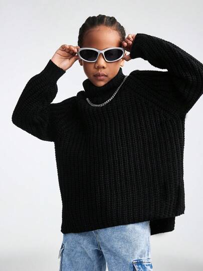 SHEIN Tween Girls' Solid Color Black Turtleneck Long Sleeve Simple Casual Top - Black - View 1
