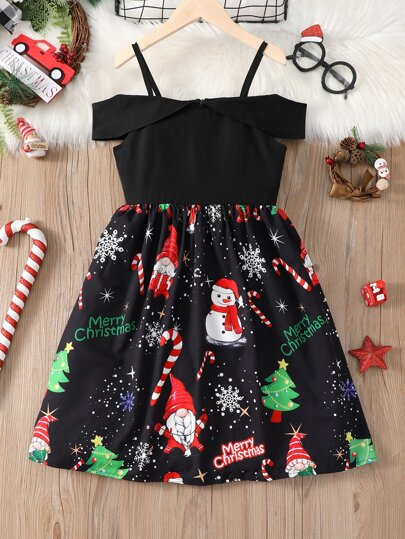 Tween Girls Christmas Print Party Dress - Black - View 1