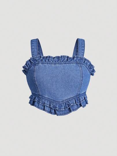 Tween Girls Fashionable Stylish Denim Frill Trim Jumper Vest,Holiday,Summer,Travel - Dark Wash - View 1
