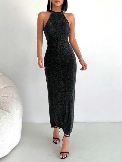 EURMUSE Twist Front Halter Neck Glitter Dress - Black - View 1