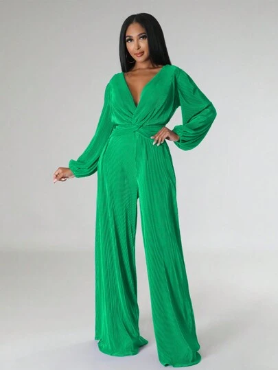 Solid Color Casual Deep V-Neck Twist Detail Jumpsuit, Spring/Fall - Dark Green - View 1