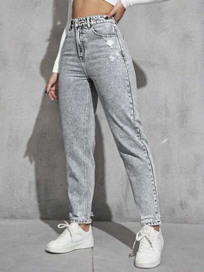 EURMUSE Women's Light Wash Ripped Tapered Casual Denim Jeans - Light Grey - View 1