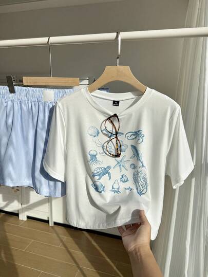Comfortcana Plus Size Women's Starfish Print Short Sleeve T-Shirt And Striped Shorts Set, Summer,2 Pieces Summer OutfitSummer Outfits For Women 2 Pieces Sets Woman - Blue and White - View 1