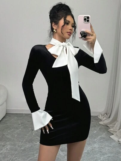 Chiquease Velvet Patchwork V-Neck Mini Dress For Women - Black and White - View 1