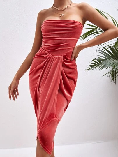 Velvet Tulip Hem Bandeau Dress - Watermelon Pink - View 5